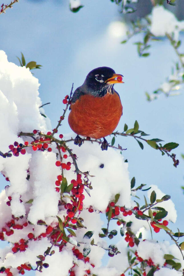 - While they eat a variety of insects and berries, it has been noted that robins can eat up to 14’ of earthworms in a day!